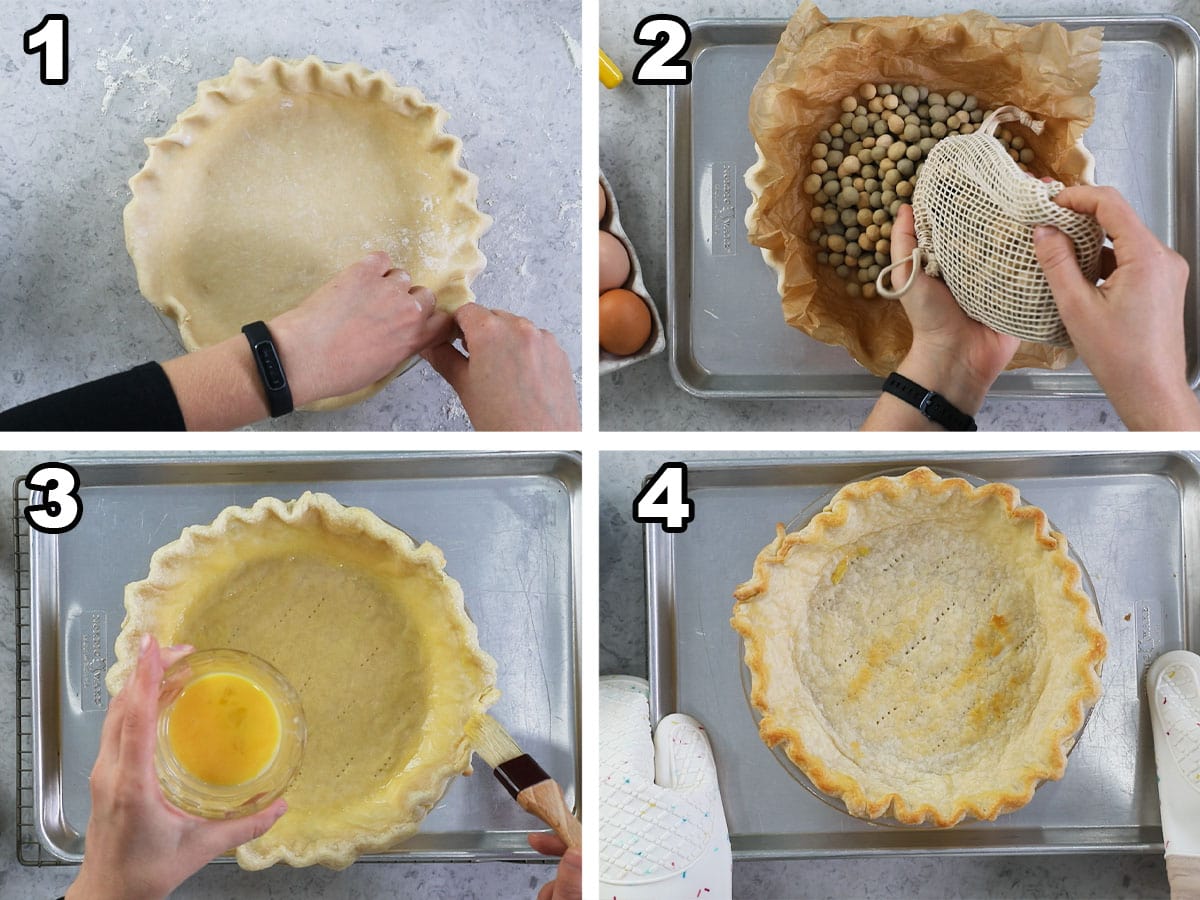 - Egg wash: remove the crust from the oven, carefully lift out the parchment and pie weights, and set aside. Poke the bottom crust with a fork, then brush all over with egg wash (this helps keep the pie crust from becoming soggy).